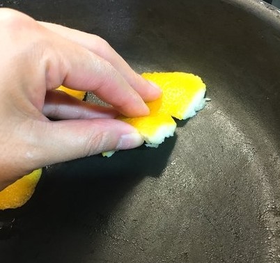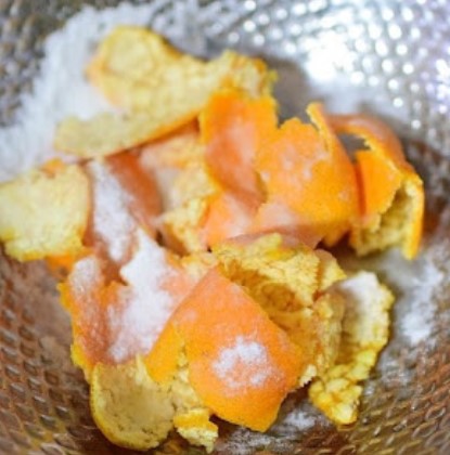 미끈거리고 냄새나는 기름때 끼는 프라이 팬 등의 기름때 제거에는 아주 좋습니다. 귤껍질 안쪽으로 문질러주면 쉽게 제거할 수 있습니다. 또 하나 물과 귤껍질을 끓이면 찌든때와 냄새 제거에 효과적입니다.