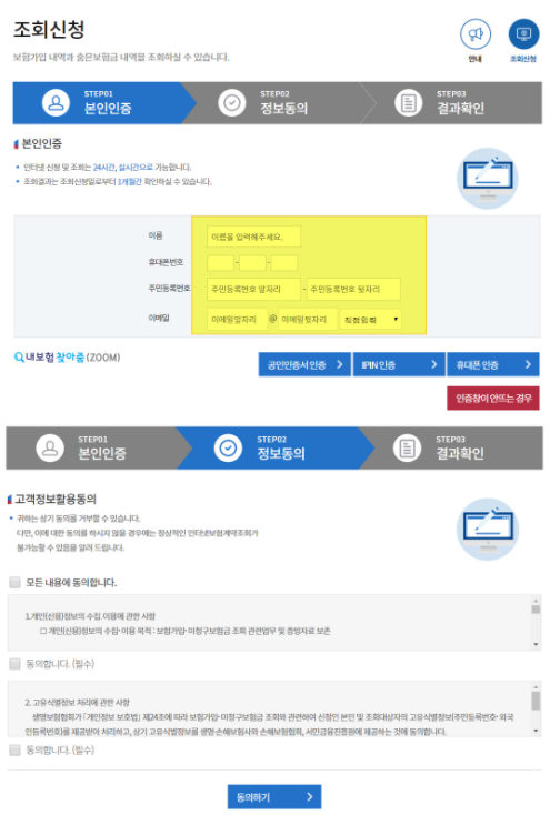 내보험찾아줌 사이트 이용 시 이름, 휴대포 번호, 주민등록번호와 이메일 등의 정보 입력과 함께