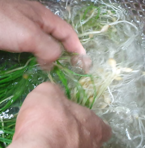 뿌리쪽 검은 부분은 손끝으로 뜯어낸 후 흐르는 물에 살살 씻어줍니다. 먹기 좋은 크기로 잘라주시기 바랍니다.