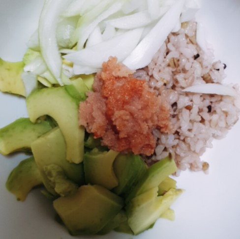 따뜻한 밥에 아보카도를 올려놓고 명란마요를 올려주고 거기에 샐러드를 놓아주고 달걀 후라이를 올립니다.