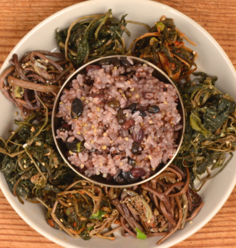 모든 곡물의 풍년을 기원하고 겨울철 영양보충의 의미를 담고 있는 오곡밥과 묵은 나물.