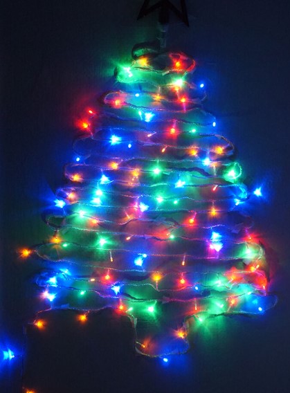 나무를 기본틀로 하여 조명으로 트리의 윤곽선을 잡아주면 멋진 트리모양이 나타납니다. 전기코드를 붙일때는 뜨거운 접착제는 사용하지 마시기 바랍니다.