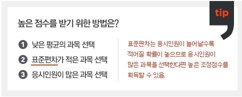 응시인원이 많으면 많을수록 표준편차가 적어질 확률이 높으므로 최대한 많은 인원이 선택하는 과목을 준비하셔야 높은 조정점수를 가져가실 가능성이 높습니다.