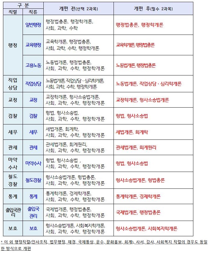 2022년 개편사항으로 사회,과학, 수학과 같은 고교과목이 폐지되고 일반행정을 제외한 다른 직렬에서 행정학개론이 제외됩니다. 2021년 공무원 시험까지는 유지됩니다.